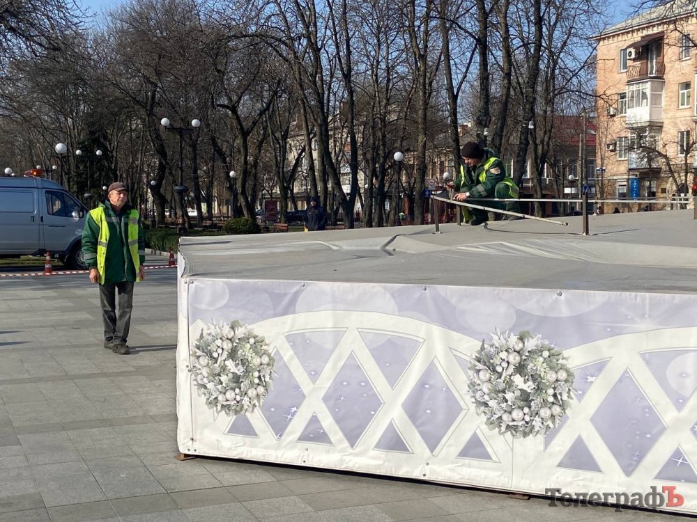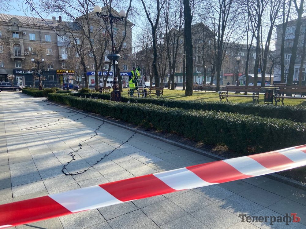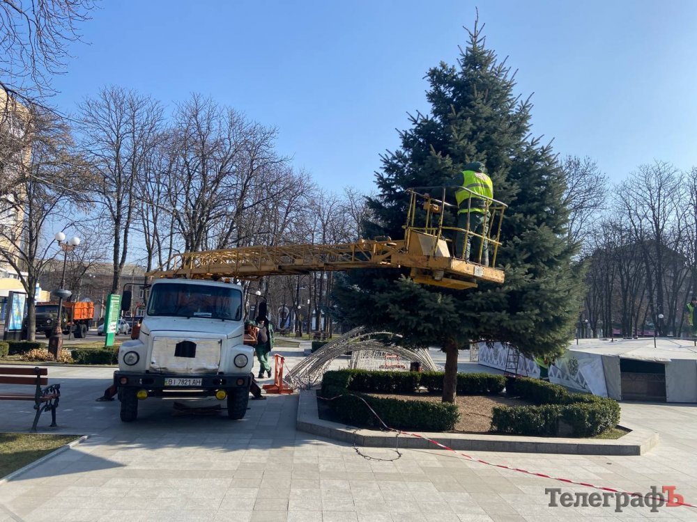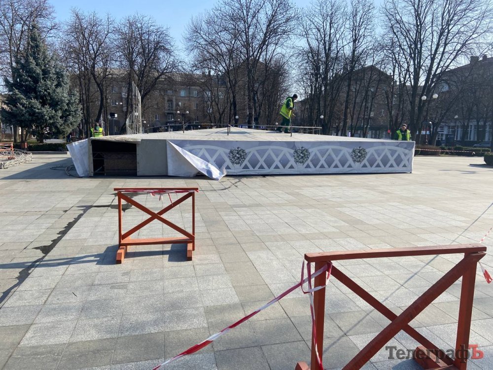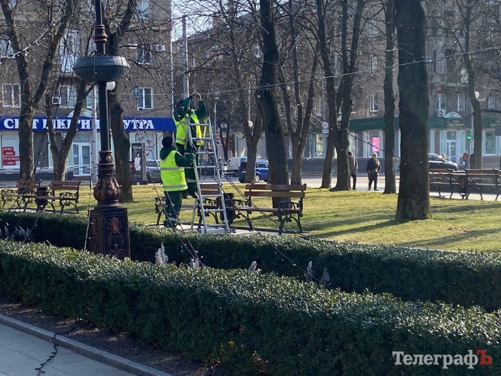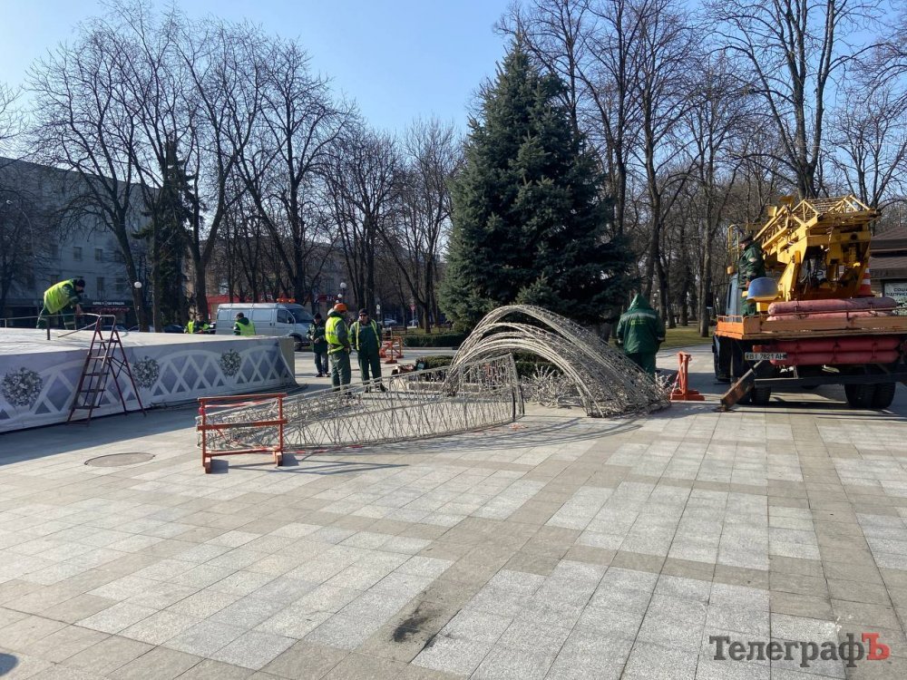 Сьогодні, 6 березня, у Кременчуці наш фотокореспондент Артем Коваленко став свідком того, як працівники «Благоустрій Кременчука» прибирають зимову ілюмінацію у сквері імені Олега Бабаєва.