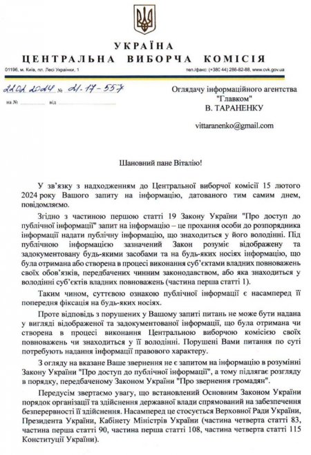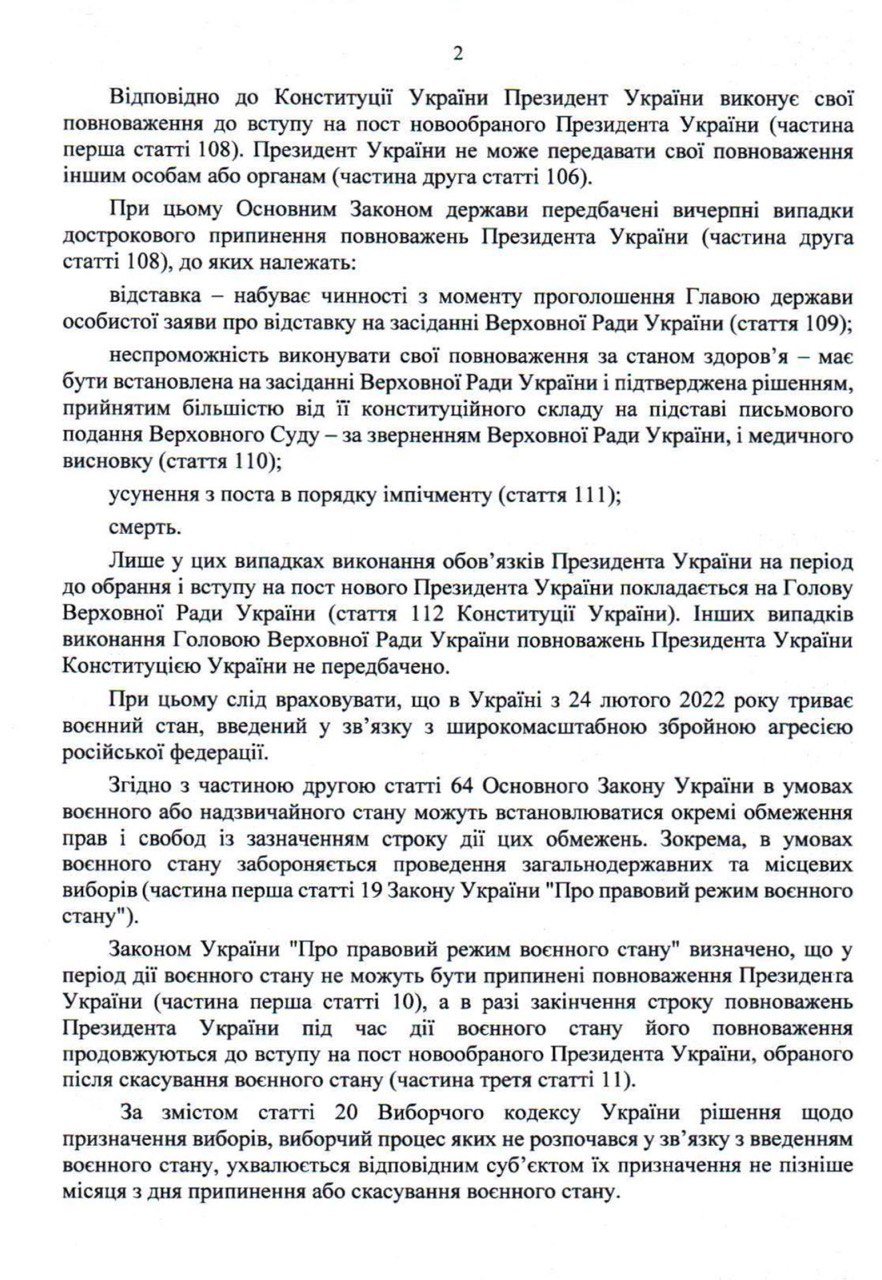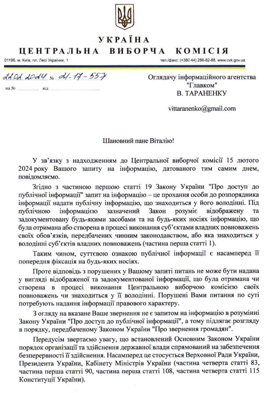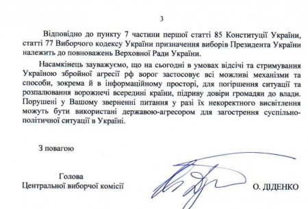 У відповіді ЦВК посилається на статті 106 та 108 Конституції України та вказує на закладену у Конституції безперервність здійснення влади та виконання президентом повноважень до вступу на посаду наступника. Також наголошується на відсутності підстав щодо передачі президентських функцій до голови Верховної Ради.