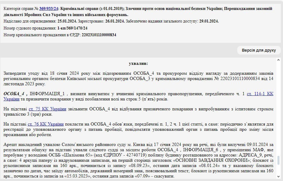 Охоронець визнав свою вину та 18 січня 2024 року пішов на угоду з прокурором. Суд затвердив цю угоду у кримінальному провадженні №22023101110000834 від 14 листопада 2023 року та постановив вирок: 5 років позбавлення волі з іспитовим терміном 3 роки.