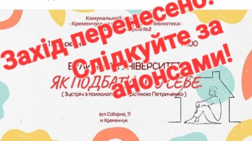Нагадаємо, захід з циклу «Ментальне здоров’я: як подбати про себе» у рамках Вуличного університету мав відбутися цієї неділі, 17 березня, о 14.00 у приміщенні абонемента філії №2 Кременчуцької міської публічної бібліотеки за адресою вул. Соборності, 11. На відвідувачів чекала б зустріч із психологинею та розмова про внутрішню опору людини.
