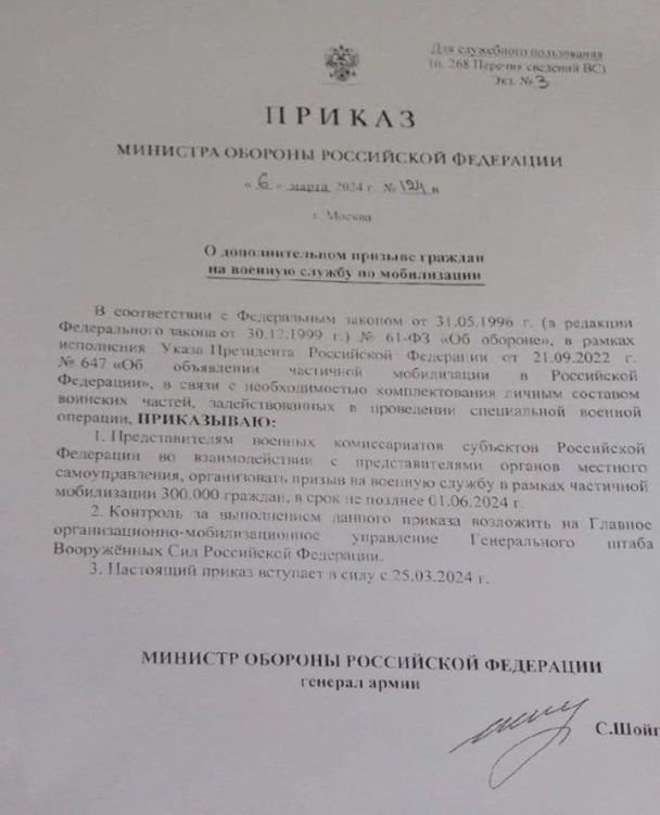 Наказ визначає завдання військовим комісарам РФ провести призов на військову службу в рамках часткової мобілізації до 300 тисяч «нових російських» громадян до 1 червня 2024.