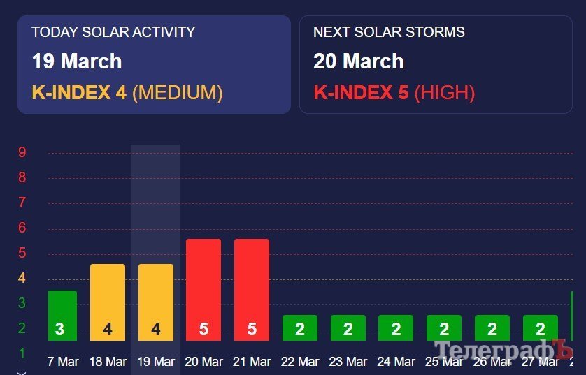 20 та 21 березня К-індекс (показник, який характеризує геомагнітну активність і класифікує геомагнітні бурі) сягне значення 5.