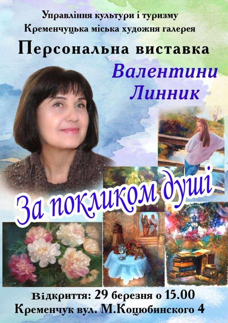 У великій залі галереї відвідувачі зможуть побачити персональну виставка «Без меж…» художниці із Горішніх Плавнів Світлани Галки, а у малій залі експонуватиметься персональна виставка кременчуцької художниці Валентини Линник «За покликом душі».