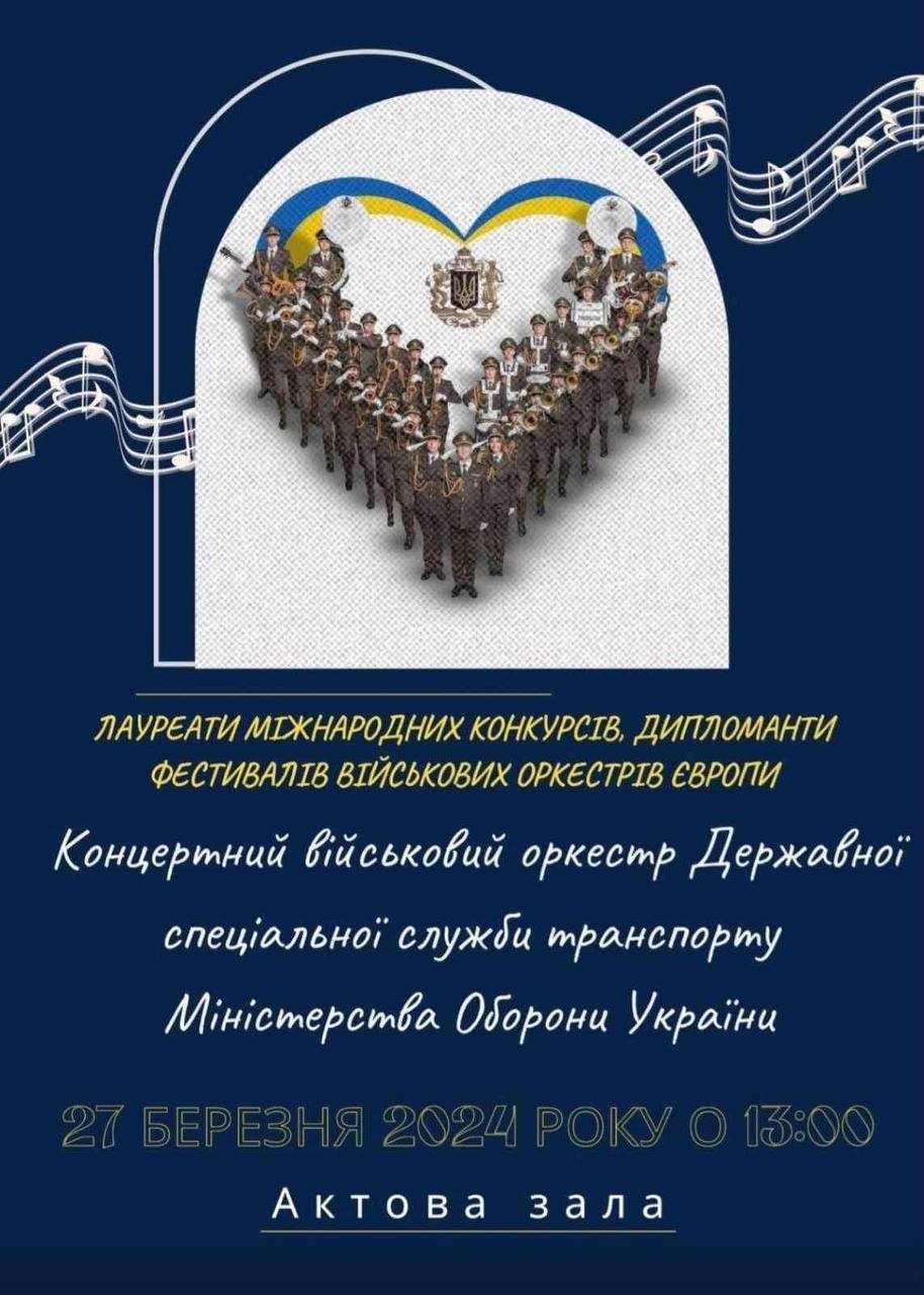 Кременчужан запрошують 27 березня відвідати концерт військового оркестру Державної спеціальної служби транспорту Міністерства оборони України.