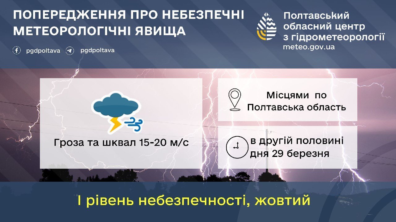 Сьогодні, 29 березня, у другій половині дня синоптики прогнозують штормове попередження, рівень небезпеки — І (жовтий).