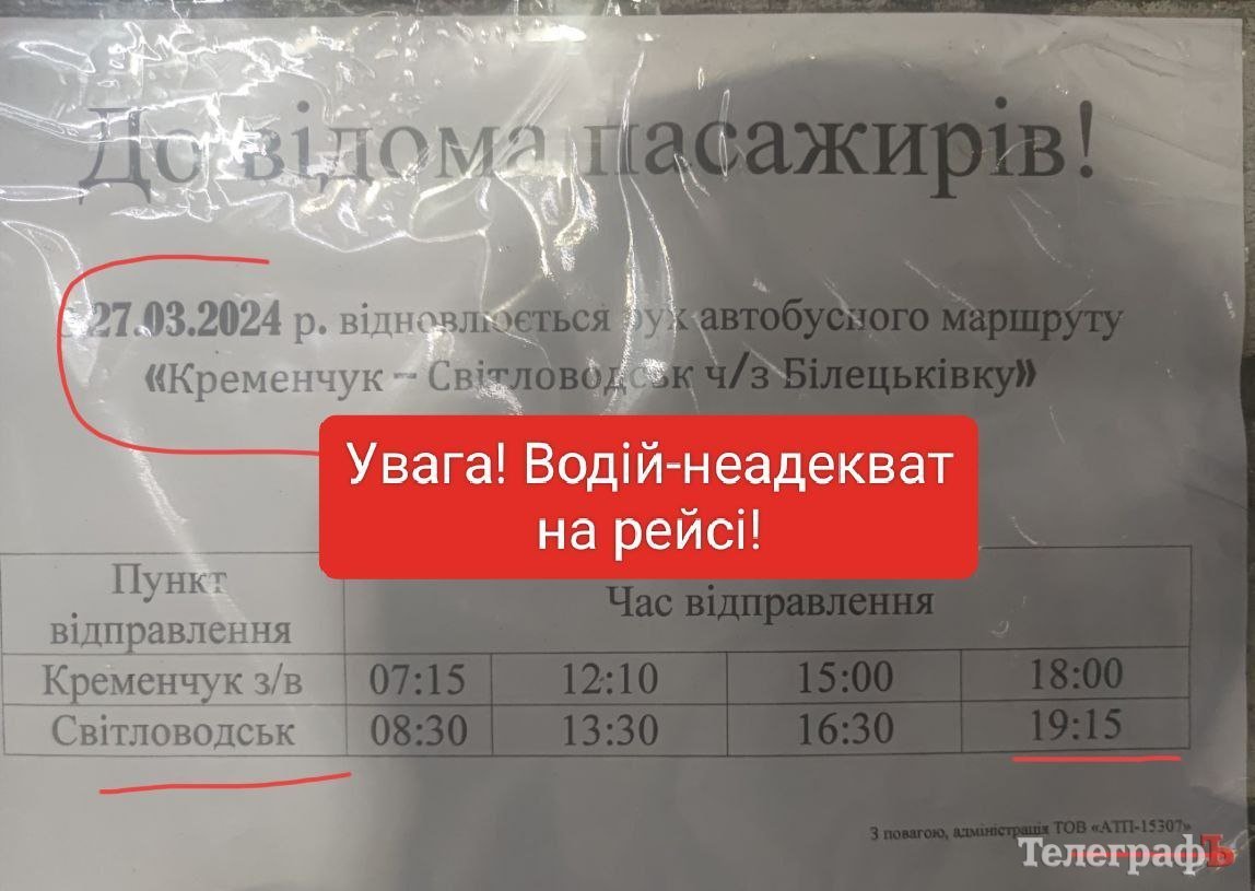 Сьогодні, 29 березня, до редакції «Кременчуцького Телеграфа» звернулася жінка, яка стверджує, що водій маршрутки Кременчук-Світловодськ, яка прямує через Білецьківку відмовився везти людей через Крюківський міст.