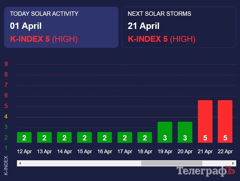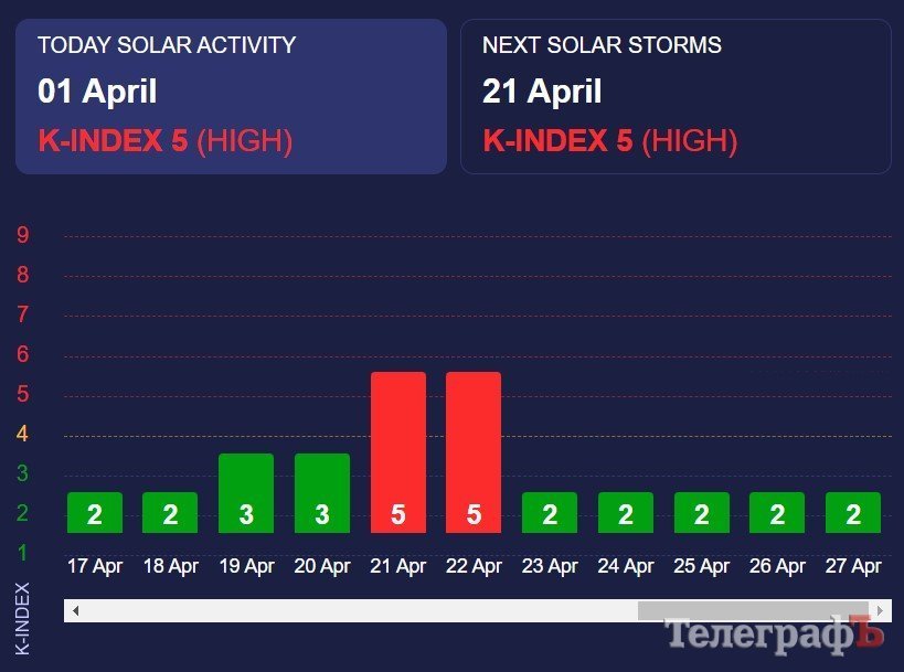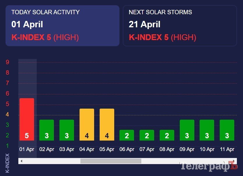 - 1 квітня — K-індекс 5 (висока магнітна буря)