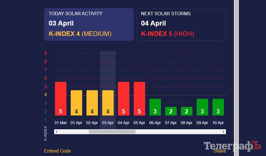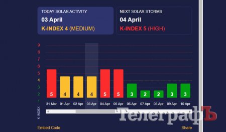 У ці дні К-індекс (показник, який характеризує геомагнітну активність і класифікує геомагнітні бурі) сягне значення 5. Втім, 6 квітня цей показник вже буде низьким — сонячна активність зменшиться.