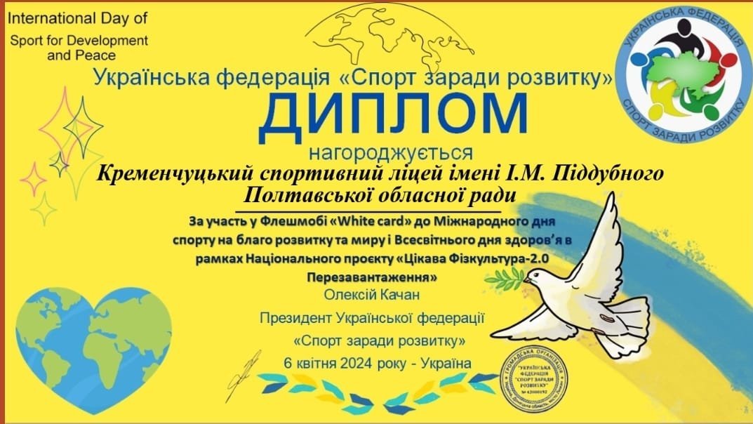 Вихованці Кременчуцького спортивного ліцею імені І.М. Піддубного долучилися до Всеукраїнського флешмобу «White card», організованого з нагоди Всесвітнього дня здоров’я. Про це «Кременчуцький Телеграф» дізнався із фейсбук-сторінки закладу освіти.