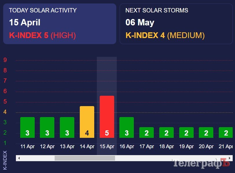 Сьогодні, 15 квітня, Землю накриє чергова магнітна буря. Про це повідомляють на порталі Meteoagent.