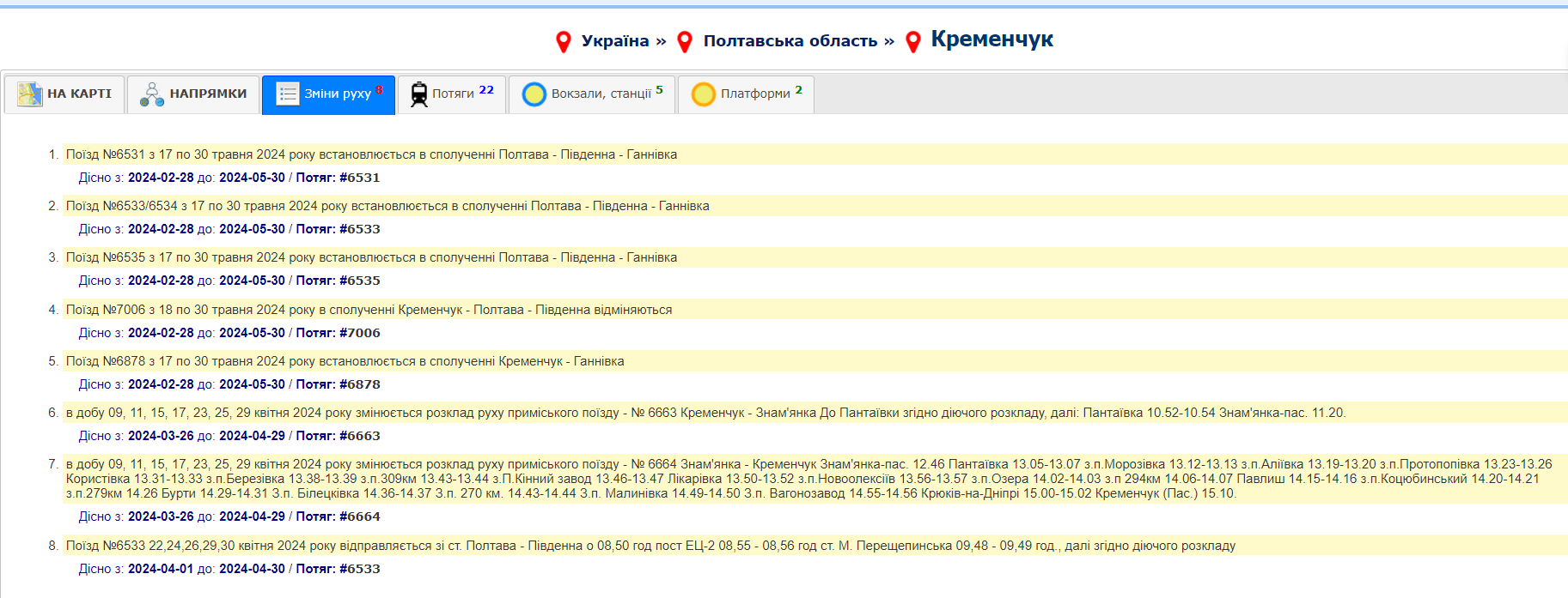 Кременчук (Пас.) 15.10. - Поїзд №6533 22, 24, 26, 29, 30 квітня відправляється зі ст. Полтава – Південна о 8.50 пост ЕЦ-2 8.55-8.56 ст. М. Перещепинська 9.48-9.49, далі згідно з діючим розкладу.