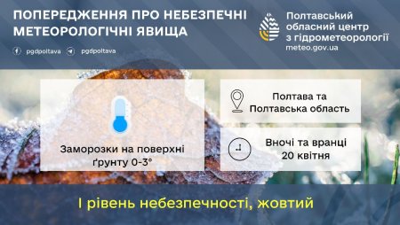 Уночі 19 квітня синоптики прогнозують заморозки та сильний вітер. Про це повідомляють у пресслужбі Полтавського обласного гідрометцентру.