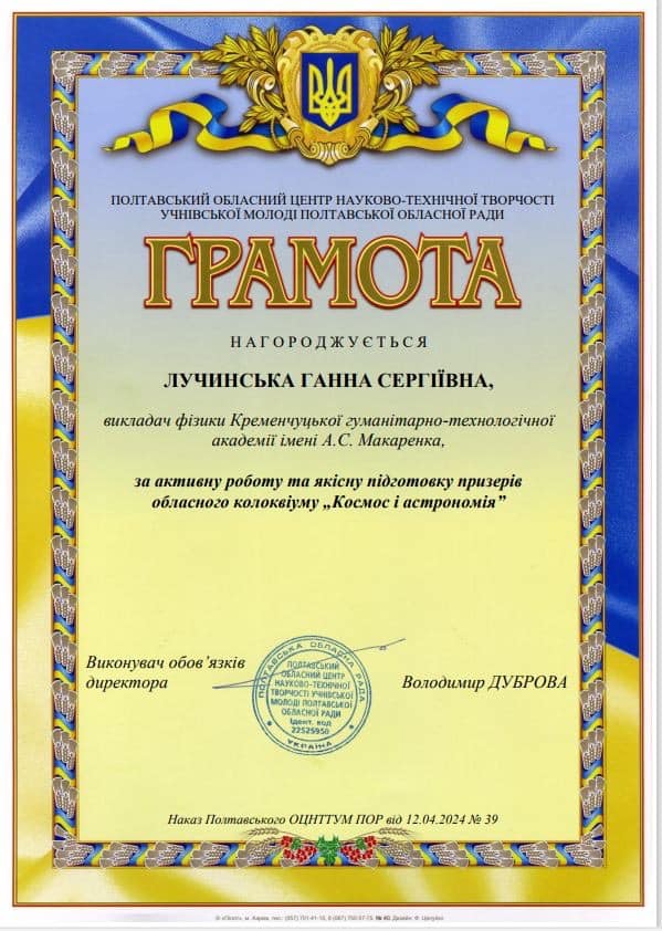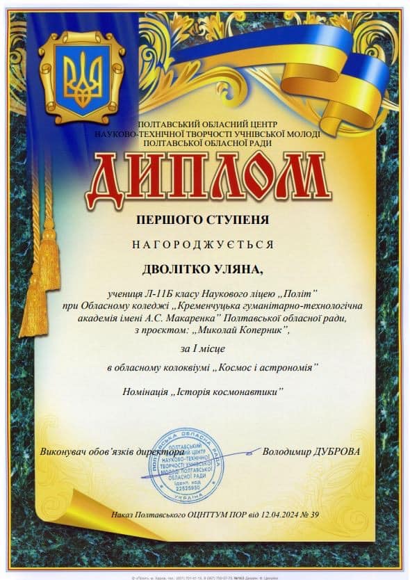 Учениця 11 класу наукового ліцею «Політ» Уляна Дволітко (Л-11Б) стала переможницею обласного колоквіуму «Космос і астрономія» у номінації «Історія космонавтики».