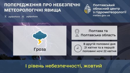 У другій половині дня 21 квітня та в першій половині ночі 22 квітня очікуються грози. Також вночі 22 квітня прогнозуються пориви вітру 15-20 м/с.