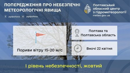 Полтавський обласний центр з гідрометеорології попереджає про небезпечні метеорологічні явища, що очікуються в області.