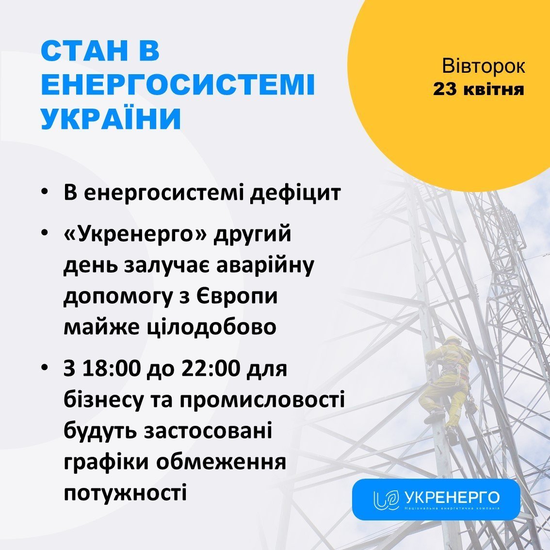 Сьогодні, 23 квітня, з 18.00 до 22.00 по всій Україні для бізнесу та промисловості застосовуватимуть графіки обмеження потужностей в енергоспоживанні. Про це повідомляють у пресслужбі Національної енергетичної компанії «Укренерго».