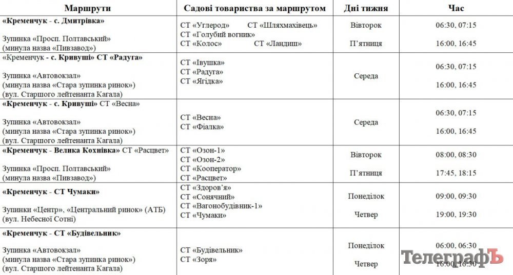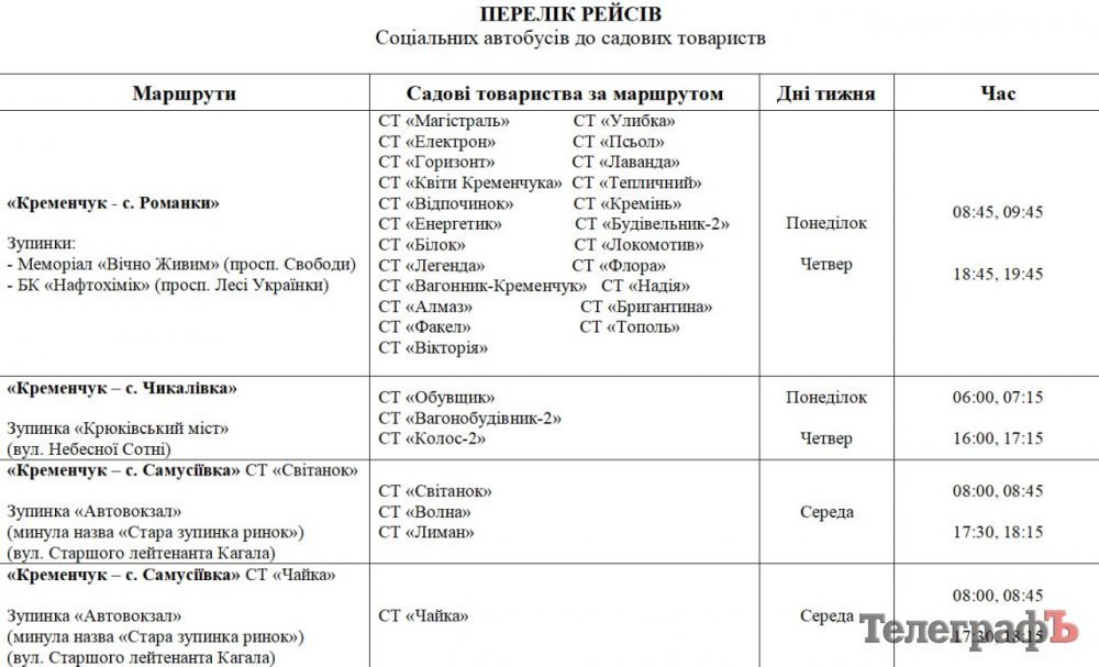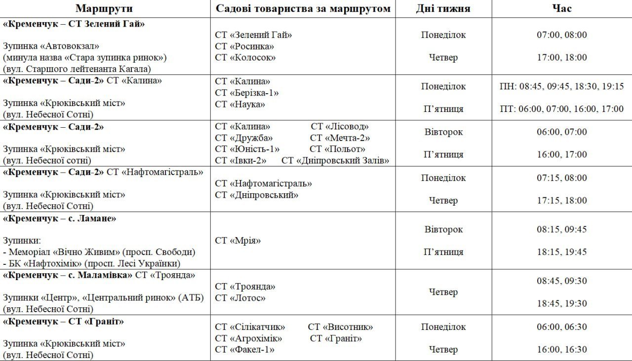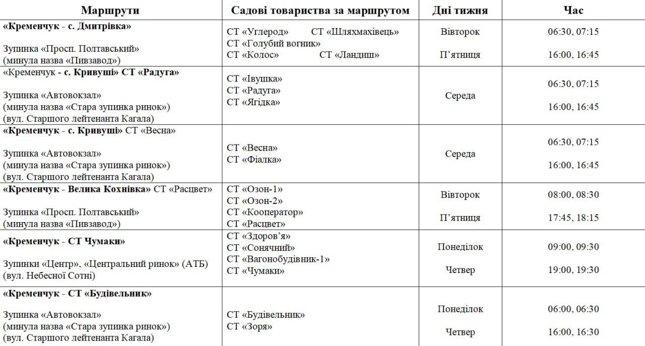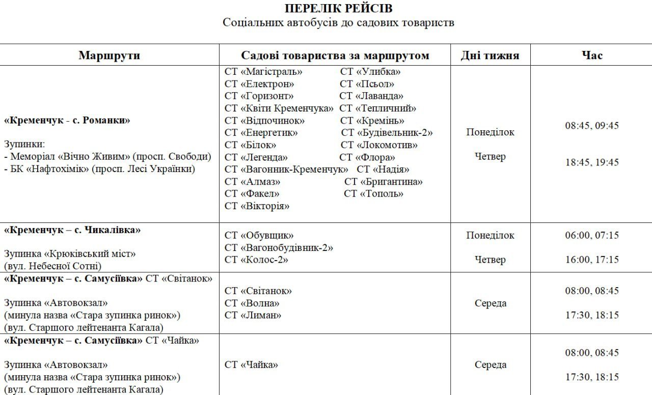 З 1 травня на дачі почнуть їздити автобуси. Про це повідомляє пресслужба Кременчуцької міської ради.