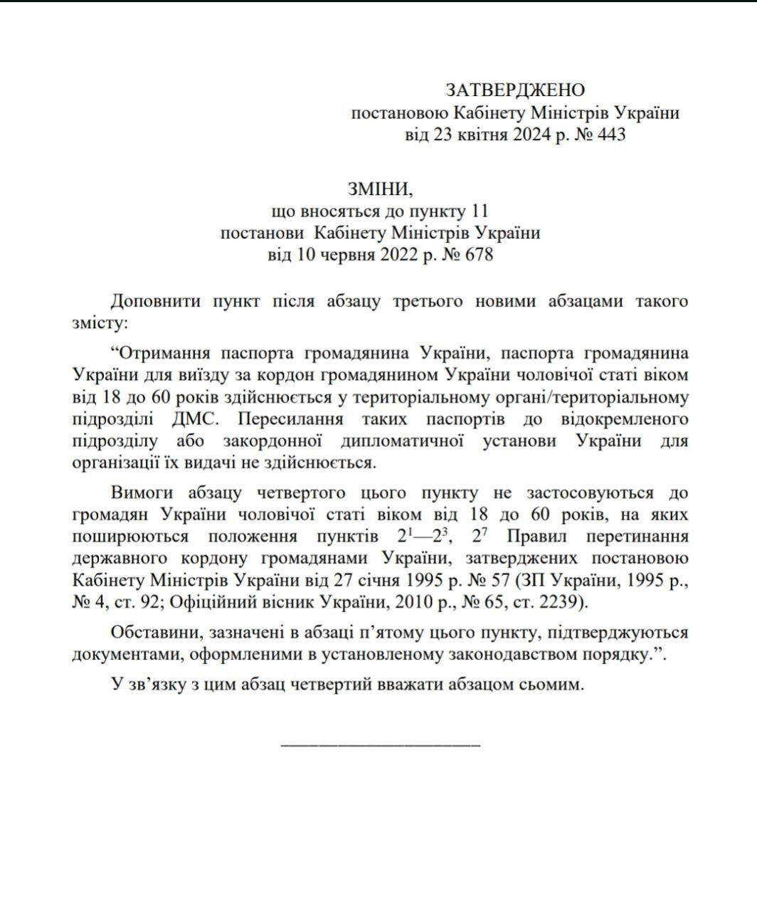 Українці призовного віку більше не зможуть отримати паспорти за межами України. Кабінет Міністрів своєю постановою №443 від 23 квітня заборонив пересилати за кордон документи, оформлені для чоловіків віком від 18 до 60 років, – паспорти громадянина України та паспорти для виїзду за кордон.