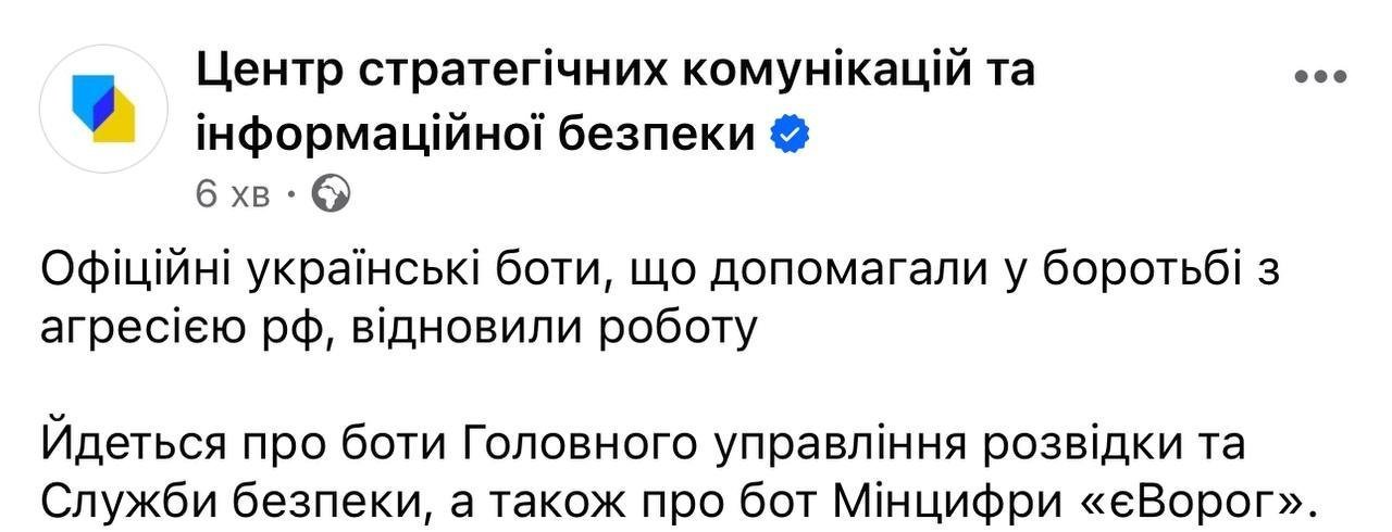В Україні відновили роботу заблоковані telegram-боти. Про це повідомляють у Центрі стратегічних комунікацій та інформаційної безпеки.