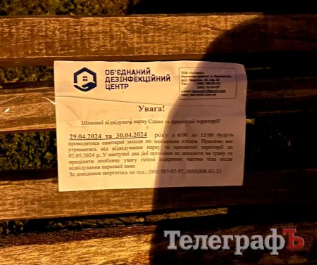 29 та 30 квітня з 6.00 до 12.00 у парку Слави та на прилеглій території комунальники будуть проводити санітарні заходи зі знищення кліщів. Про це «Кременчуцькому Телеграфу» повідомляють читачі. Відповідні оголошення з’явилися на території парку.