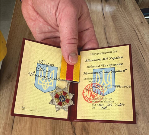Подання на нагородження Євгена Корфа медаллю «За сприяння Збройним Силам України» до Міністерства оборони України направили полковник Вячеслав Макеєв та полковник Олександр Щербина.