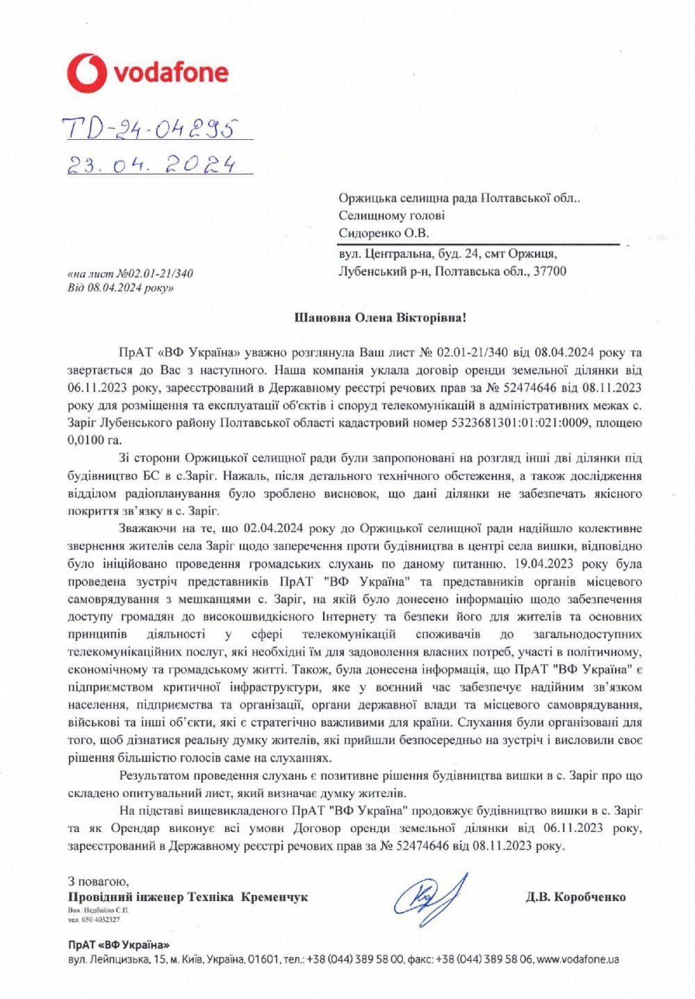 23 квітня 2024 року ПрАТ «ВФ Україна» аргументованим листом повідомило про продовження будівництва вежі на орендованій земельній ділянці у с. Заріг. Але після завершення будівництва і запуску базової станції приватне акціонерне товариство зобов’язується, на вимогу громади, запросити державну санітарно-епідеміологічну службу України. Ця служба має провести натурні вимірювання рівня електромагнітних випромінювань станції мобільного зв’язку сумісно з представниками громади та надати копії протоколів вимірів.