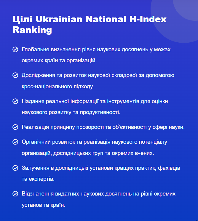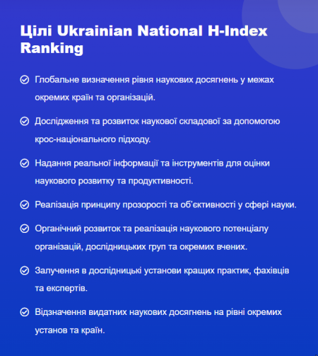 National H-index Ranking — міжнародний некомерційний рейтинг, створений з метою прозорого та уніфікованого ранжування університетів, а також наукових організацій та установ, які спеціалізуються на наукових дослідженнях. Визначають рейтинг установ шляхом оцінки продуктивності наукових досягнень.