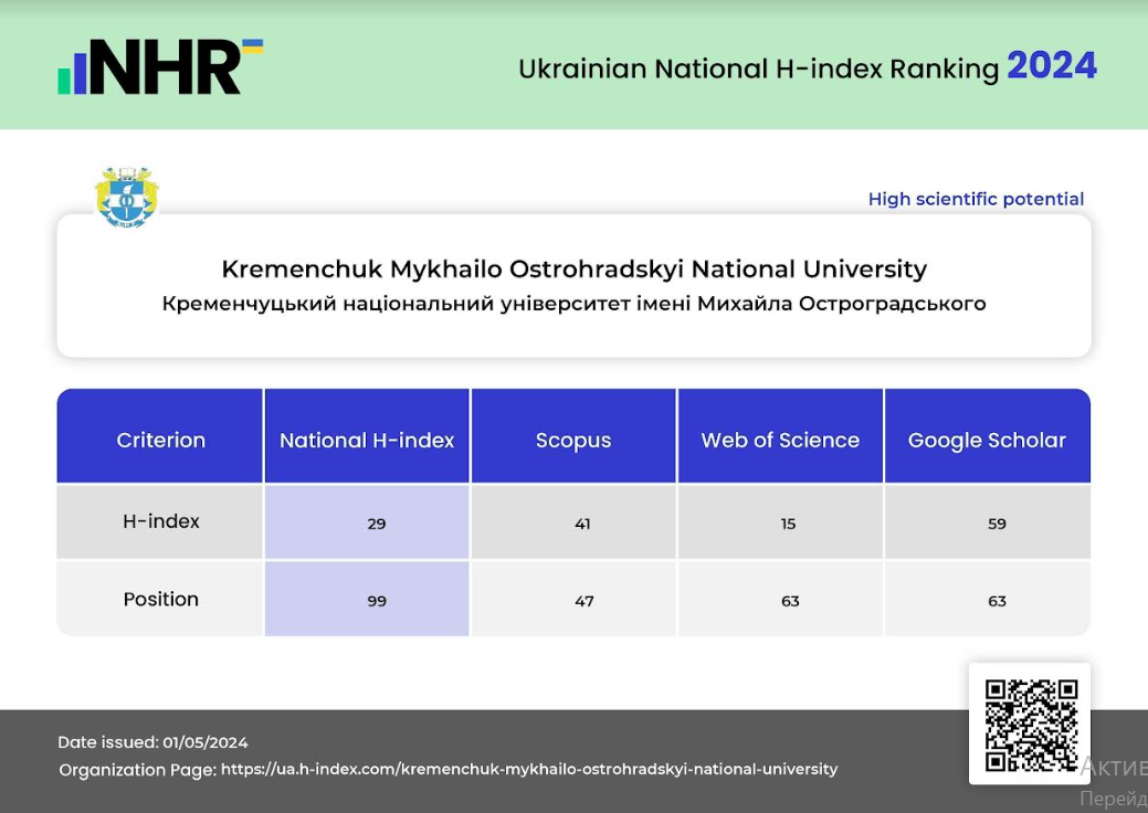 Показники Кременчуцького національного університету становлять: Scopus — 41; Web of Science — 15; Google Scholar — 59. Загальний бал у рейтингу — 29. Досягнуті результати дозволили КрНУ увійти до Топ-100 найкращих закладів вищої освіти України за версією National H-index Ranking.