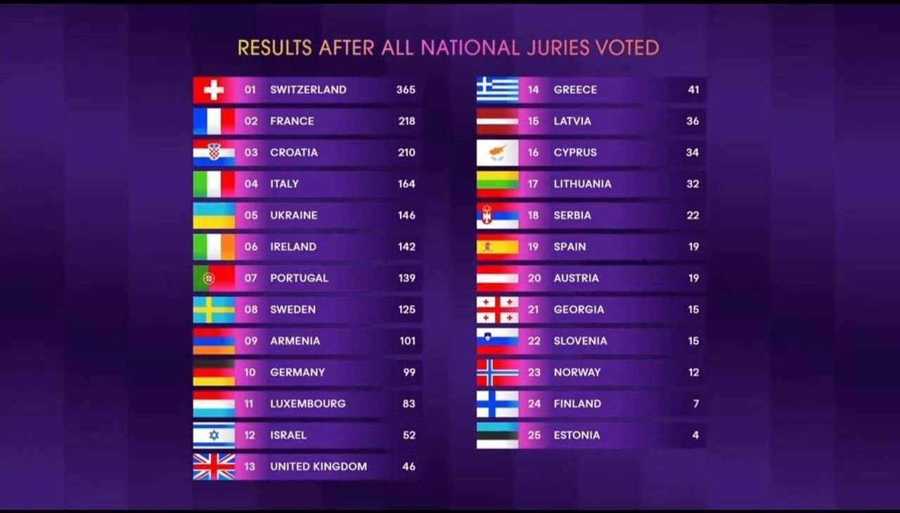 Максимальні 12 балів представнику Швейцарії поставили професійні журі більшості країн-учасниць, зокрема й України. За підсумками голосування журі Швейцарія отримала 365 балів – найвищий показник.