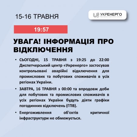 даними пресслужби НЕК «Укренерго», сьогодні, з 15.25 до 22.00 графіки аварійних відключень застосували по усіх регіонах України.