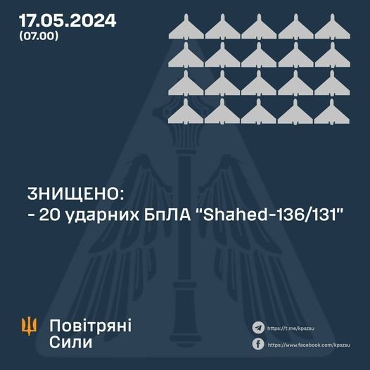 У ніч на 17 травня Росія атакувала Україну 20 ударними БпЛА типу «Shahed-131/136» із районів Приморсько-Ахтарськ та Курськ РФ.
