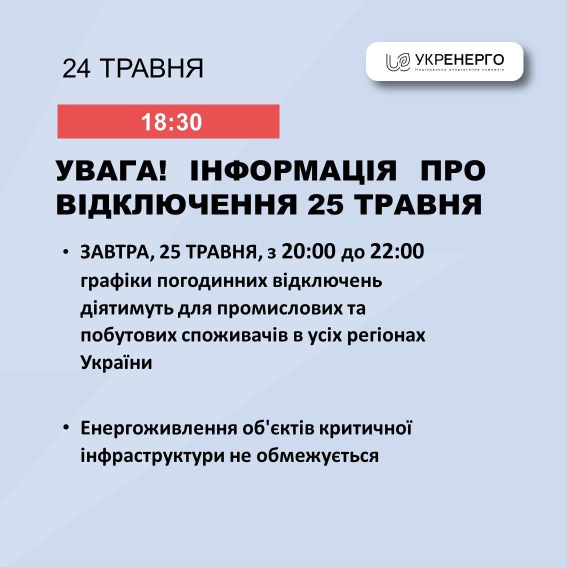 Енергоживлення об’єктів критичної інфраструктури обмежувати не будуть.