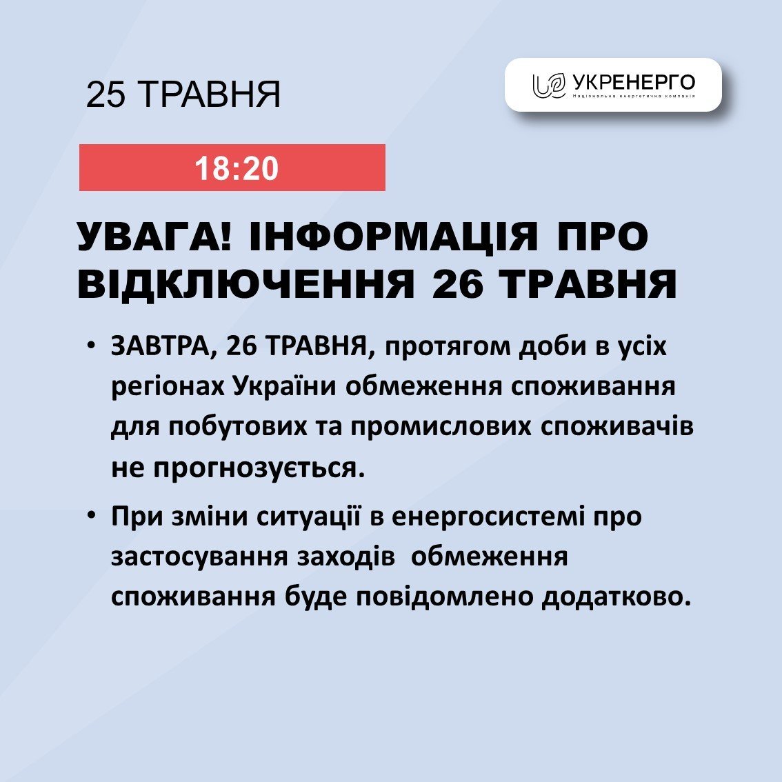 Завтра, 26 травня, у Кременчуці та на Полтавщині графіки погодинного відключення світла не планують застосовувати. Про це повідомляють у пресслужбі Національної енергетичної компанії «Укренерго».