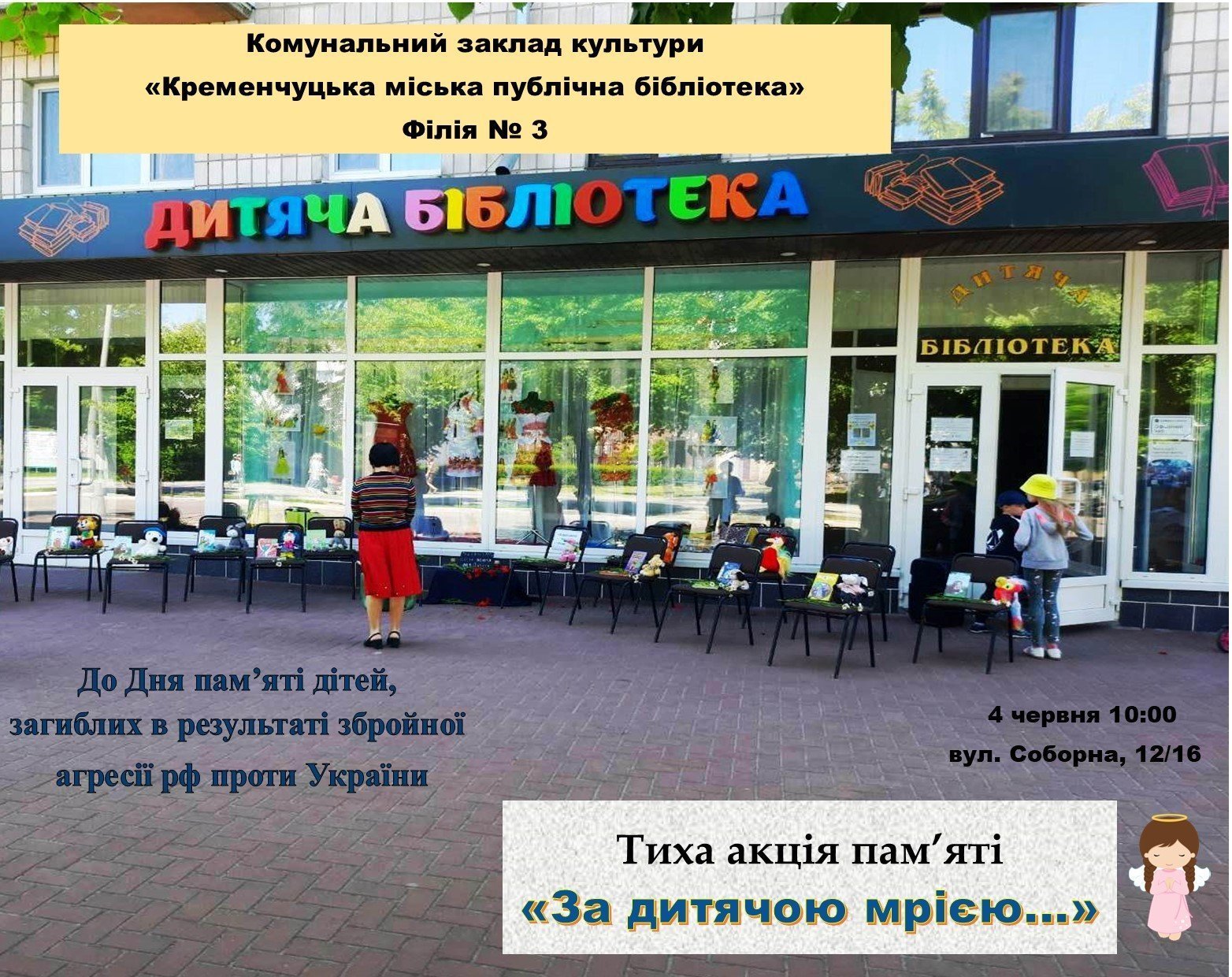 Завтра, 4 червня, у Кременчуці на майданчику перед філією №3 Кременчуцької міської публічної бібліотеки відбудеться тиха акція пам’яті «За дитячою мрією…». Про проведення заходу журналістам «Кременчуцького Телеграфа» повідомили працівники бібліотеки.