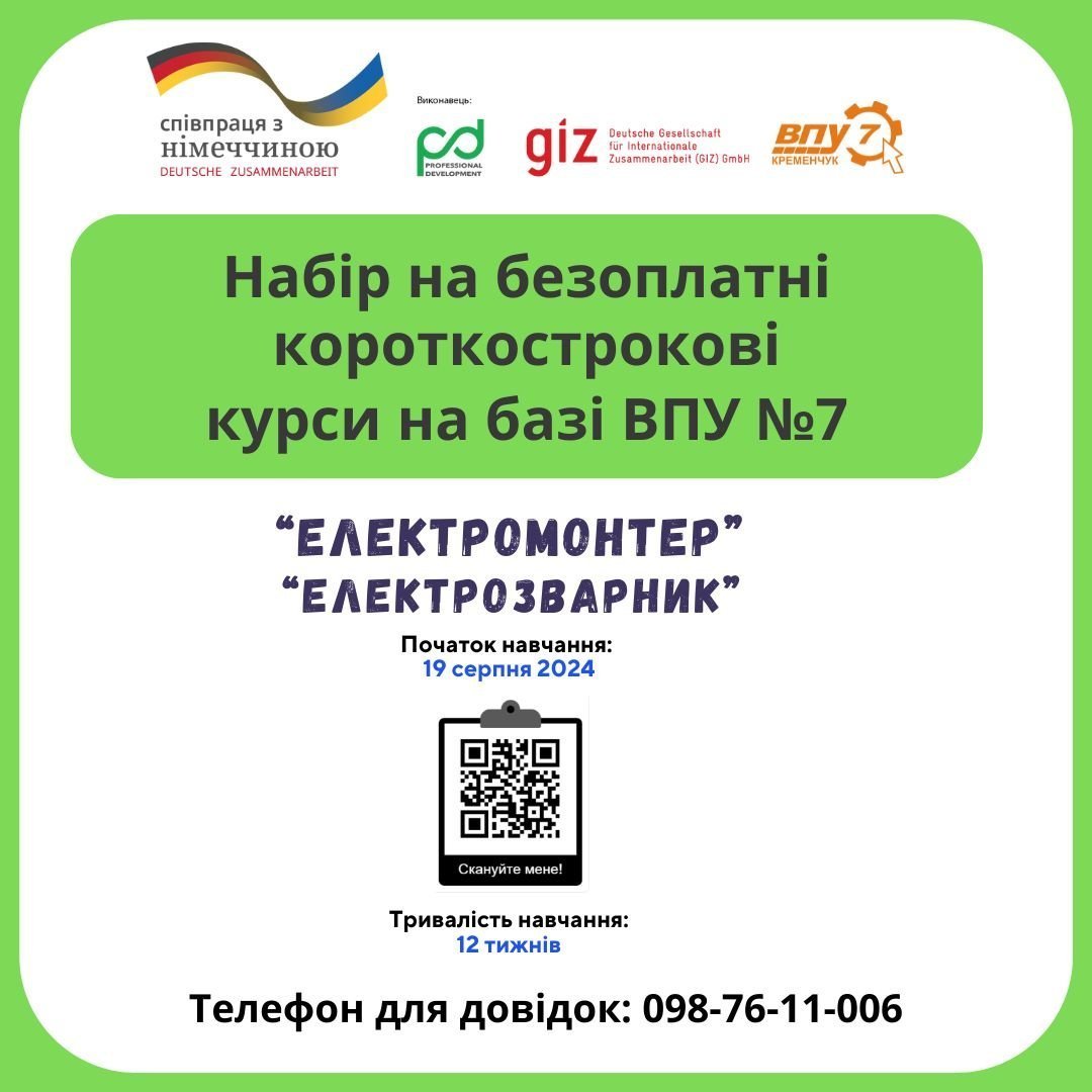 Навчання розпочнеться 19 серпня і триватиме впродовж 12-ти тижнів у приміщенні ВПУ №7 за адресою м.Кременчук, вул. Вадима Пугачова, 14.