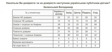 За даними КМІС станом на травень 2024 року Володимиру Зеленському довіряють 59% опитаних. Зовсім чи скоріше не довіряють главі держави 36%.