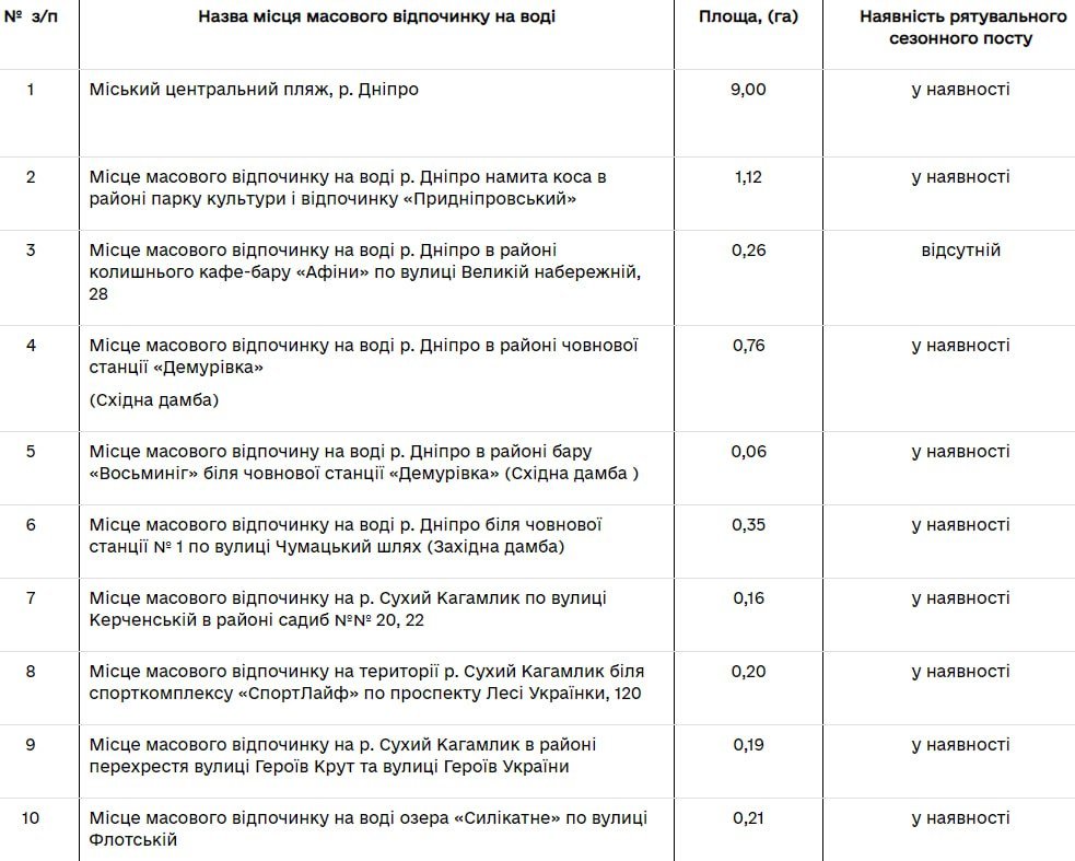 Перелік місць масового відпочинку громадян на воді, де будуть розміщені рятувальні пости, можна переглянути на світлині.