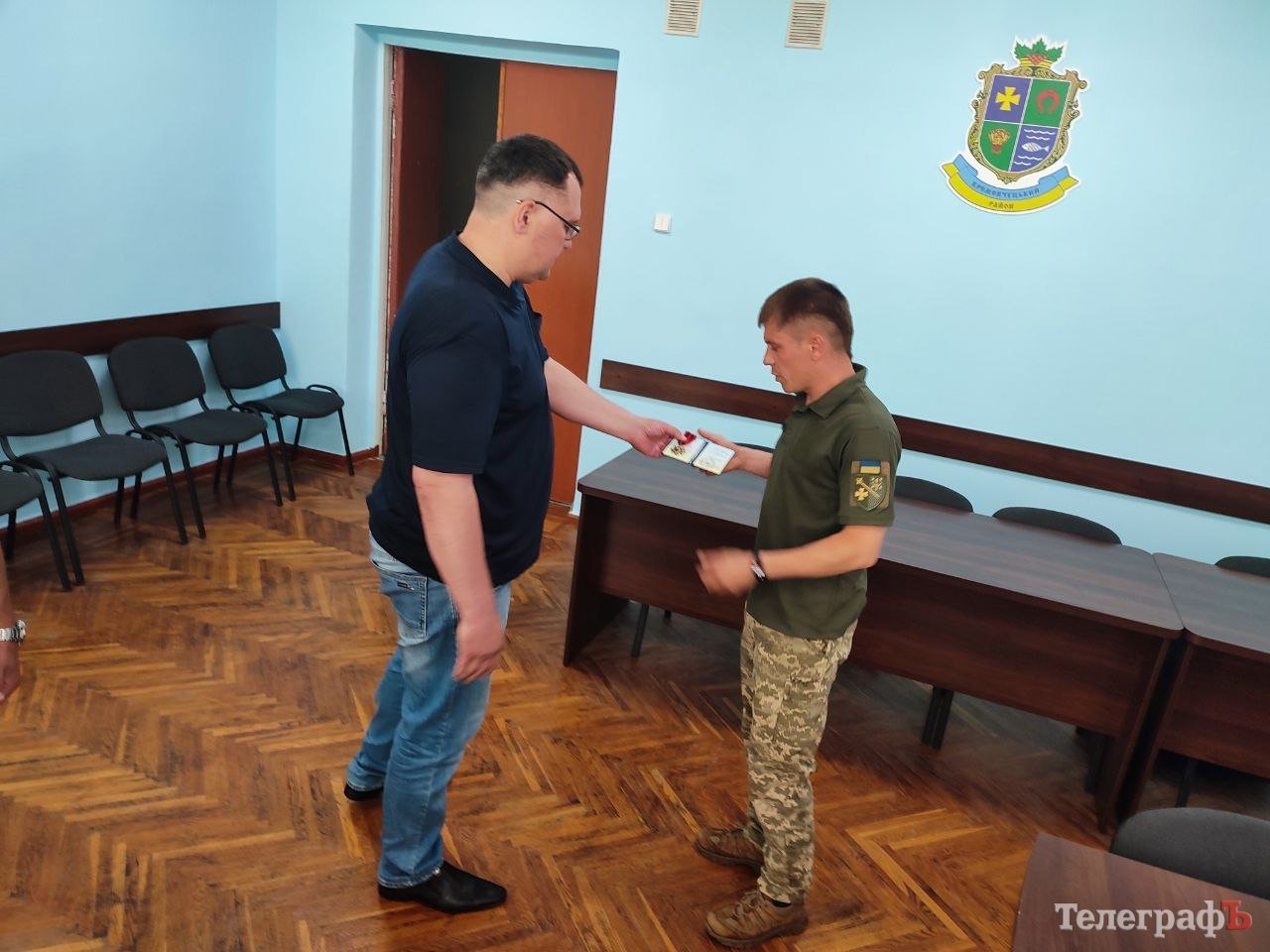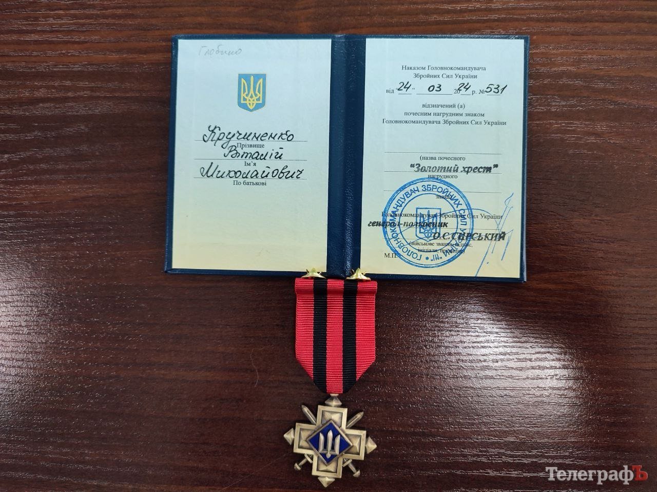 Сьогодні, 12 червня, у приміщенні Кременчуцької районної військової адміністрації, воїну з Кременчука Віталію Кручиненку вручили бойову нагороду — почесний нагрудний знак Головнокомандувача ЗСУ «Золотий хрест». Бойову відзнаку захиснику України вручали виконувач обов’язки начальника Кременчуцької РВА Артем Даценко та начальник Кременчуцького районного територіального центра комплектування та соціального захисту (ТЦК та СП) полковник Мирослав Волков.