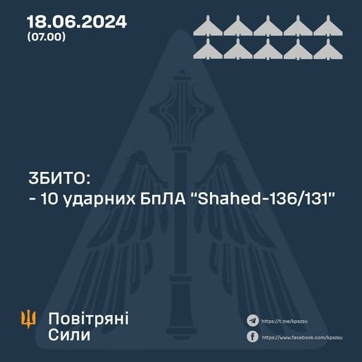 У ніч на 18 червня росіяни атакували Україну десятьма ударними БпЛА Shahed-131/136 з району Приморсько-Ахтарськ (РФ).