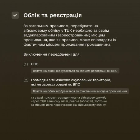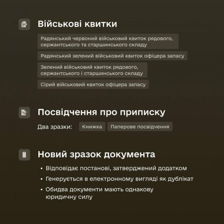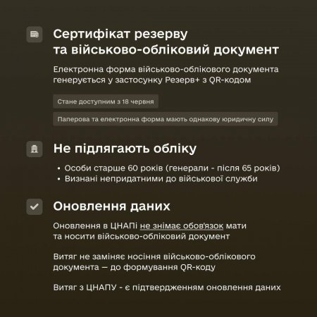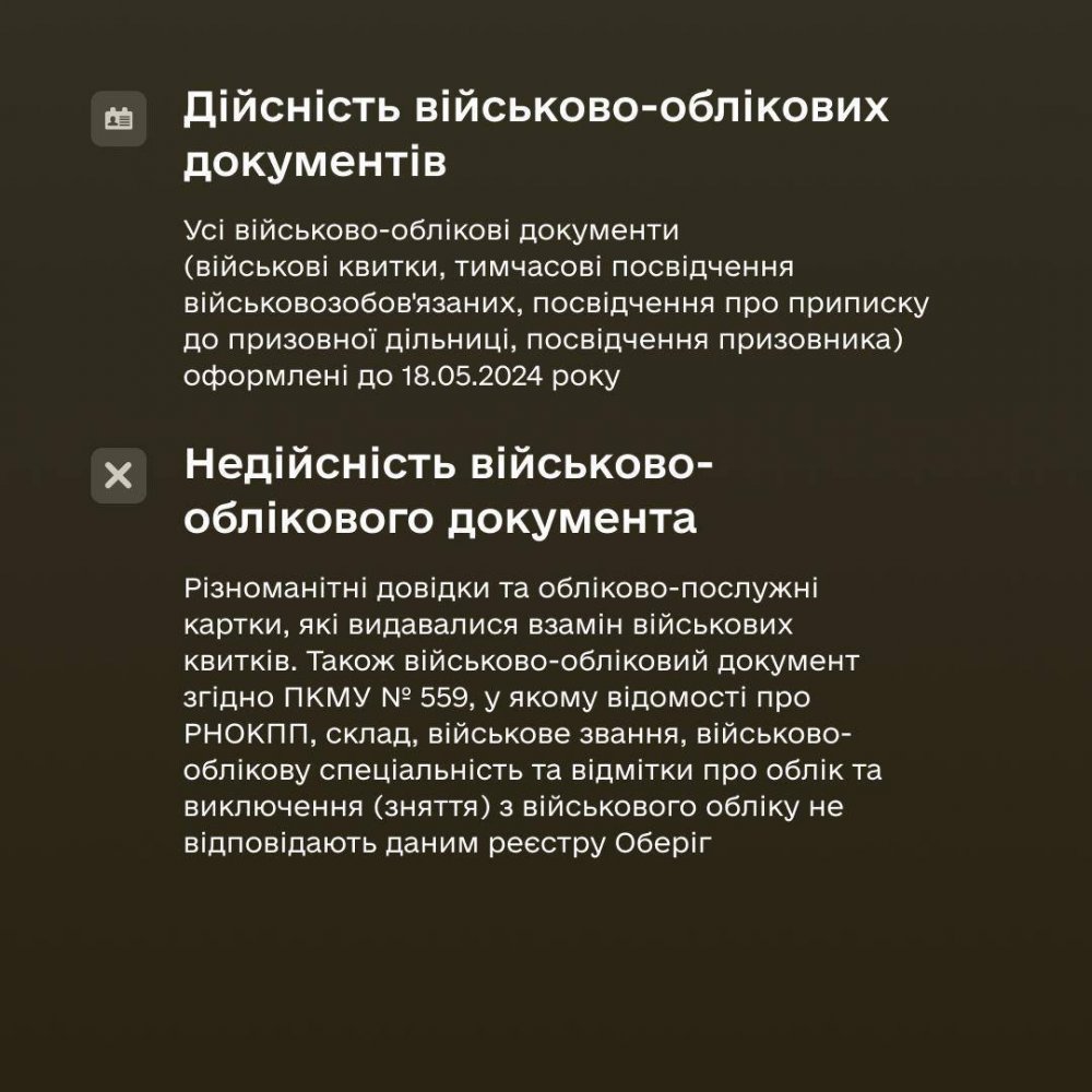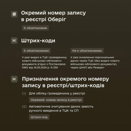 Громадяни, які отримують нові військово-облікові документи, повинні мати окремий номер запису в реєстрі Оберіг, а штрих-коди стають обов’язковими тільки при видачі нових документів через ТЦК.
