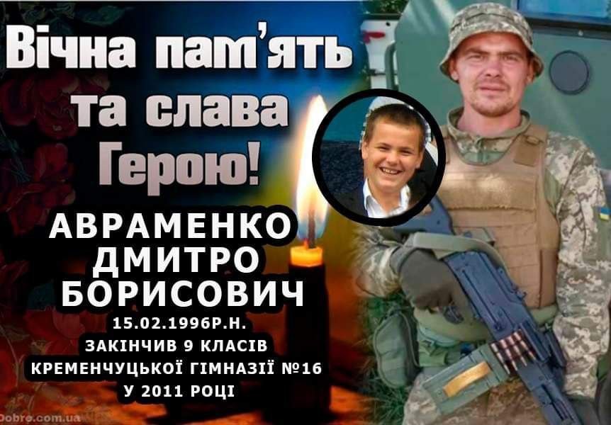 Сьогодні, 18 червня, у Міському палаці культури Кременчука попрощалися із загиблим розвідником, солдатом Дмитром Авраменком. Народився військовий 15 лютого 1996 року у Кременчуці, навчався у гімназії №16, а профосвіту здобував у Вищому професійному училищі №7. Доля склалася так, що Дмитро ще в дитинстві лишився без матері — вона померла внаслідок хвороби. Тож виховували хлопця бабуся та тітка.