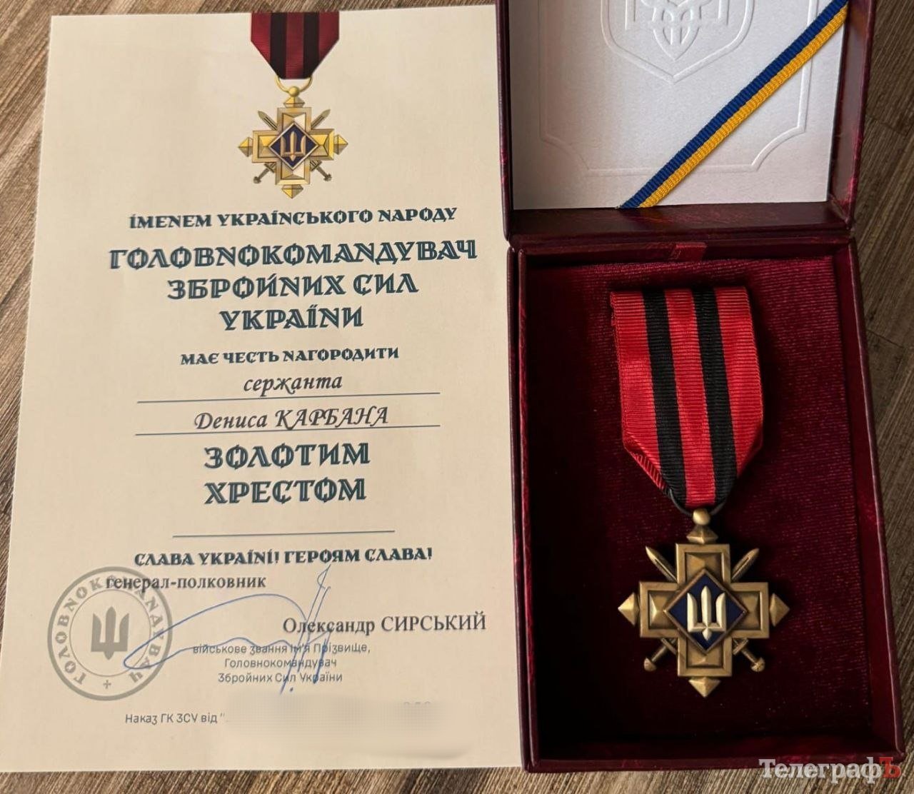 Кременчужанина Дениса Карбана нагородили відзнакою Золотий хрест. Сержант під час виконання бойових завдань виявив самовідданість, стійкість та особисту мужність в умовах, пов’язаних з ризиком для життя, професійну майстерність, сумлінне та бездоганне служіння українському народу.
