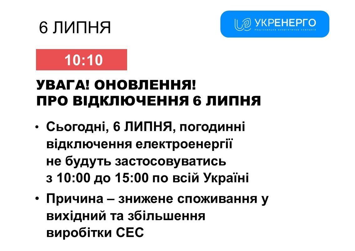 У суботу, 6 липня, із 10.00 до 15.00 світло у Кременчуці, на Полтавщині та по всій Україні не вимикатимуть. Про це повідомили у пресслужбі Національної енергетичної компанії «Укренерго».