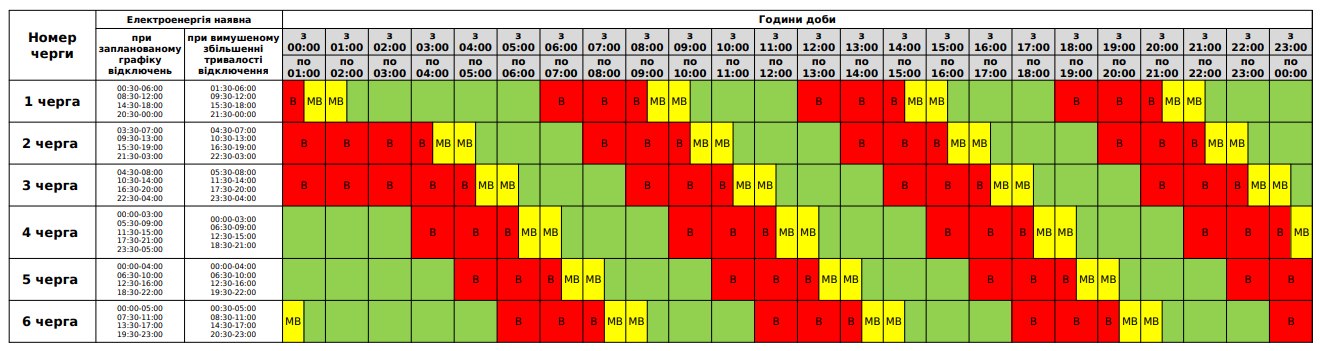 В інші години, із 00.00 до 07.00 та із 15.00 до 24.00 погодинні відключення споживачам застосовуватимуть по дві черги.