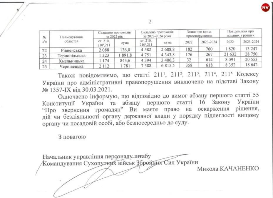 У відповіді зазначається, що у 2022 році працівники ТЦК склали 55,68 тисячі протоколів за порушення правил військового обліку (ст. 210, 210−1 КУпАП) та псування військово-облікових документів чи їхню втрату з необережності (ст. 211).