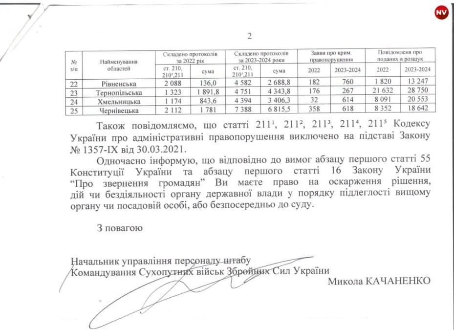 Згідно з даними відповіді Лихачову, у 2022 році ТЦК подали 100,5 тисяч повідомлень щодо розшуку осіб, які ухиляються від військової служби. З них найбільше — 21,6 тисячі у Тернопільській області, майже 15,9 тисячі — на Львівщині та 12,3 тисячі — на Івано-Франківщині.