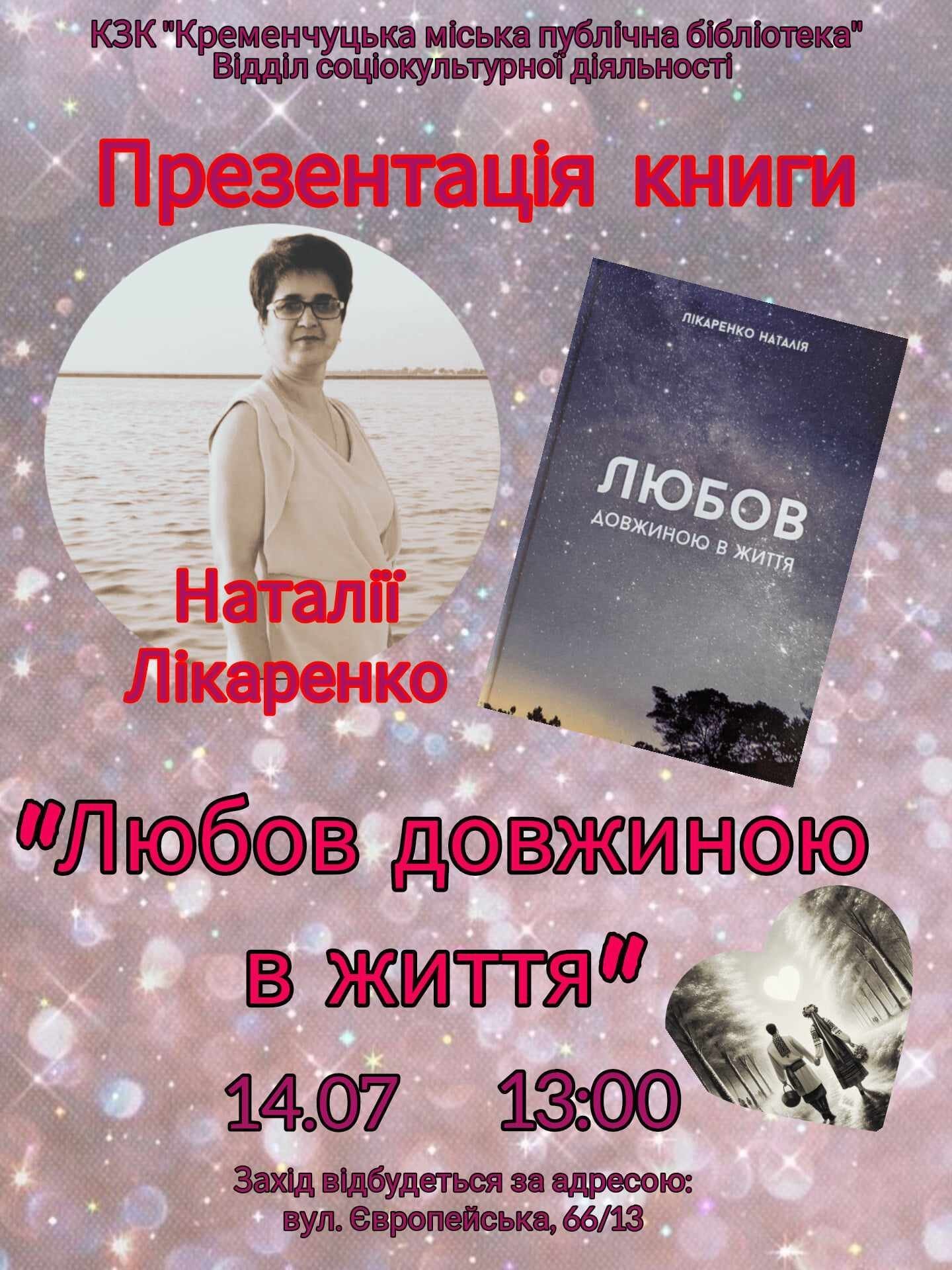 Кременчужан та гостей міста зпрошують у неділю, 14 липня, до бібліотеки на презентацію книги-повісті місцевої письменниці Наталії Лікаренко «Любов до життя». Про захід журналістам «Кременчуцького Телеграфа» повідомили працівники біблітеки.
