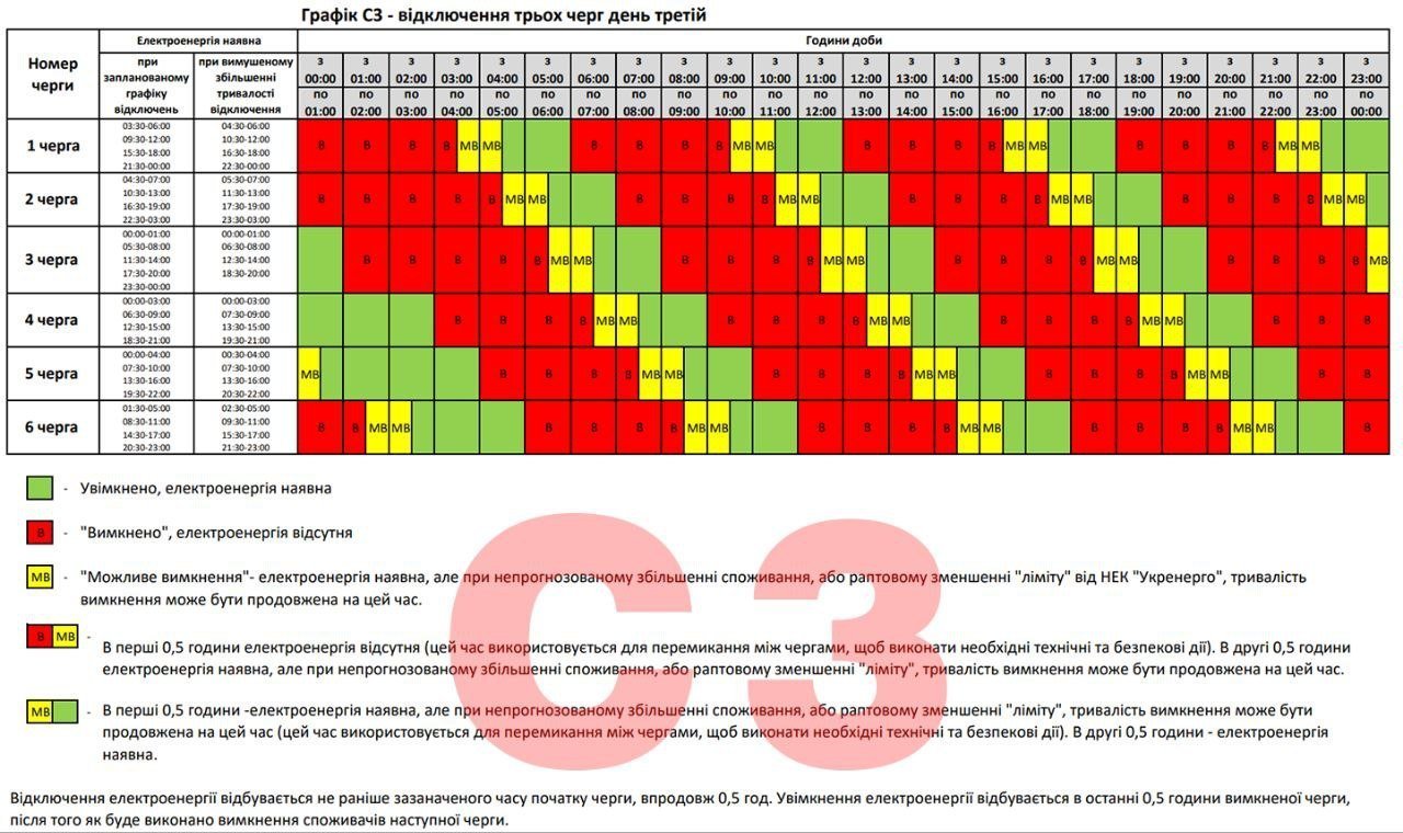 – До уваги споживачів електричної енергії! Отримана команда від НЕК «Укренерго» з 14.00 до 19.00 застосовувати три черги ГПВ – графік С3, – йдеться у повідомленні енергокомпанії.