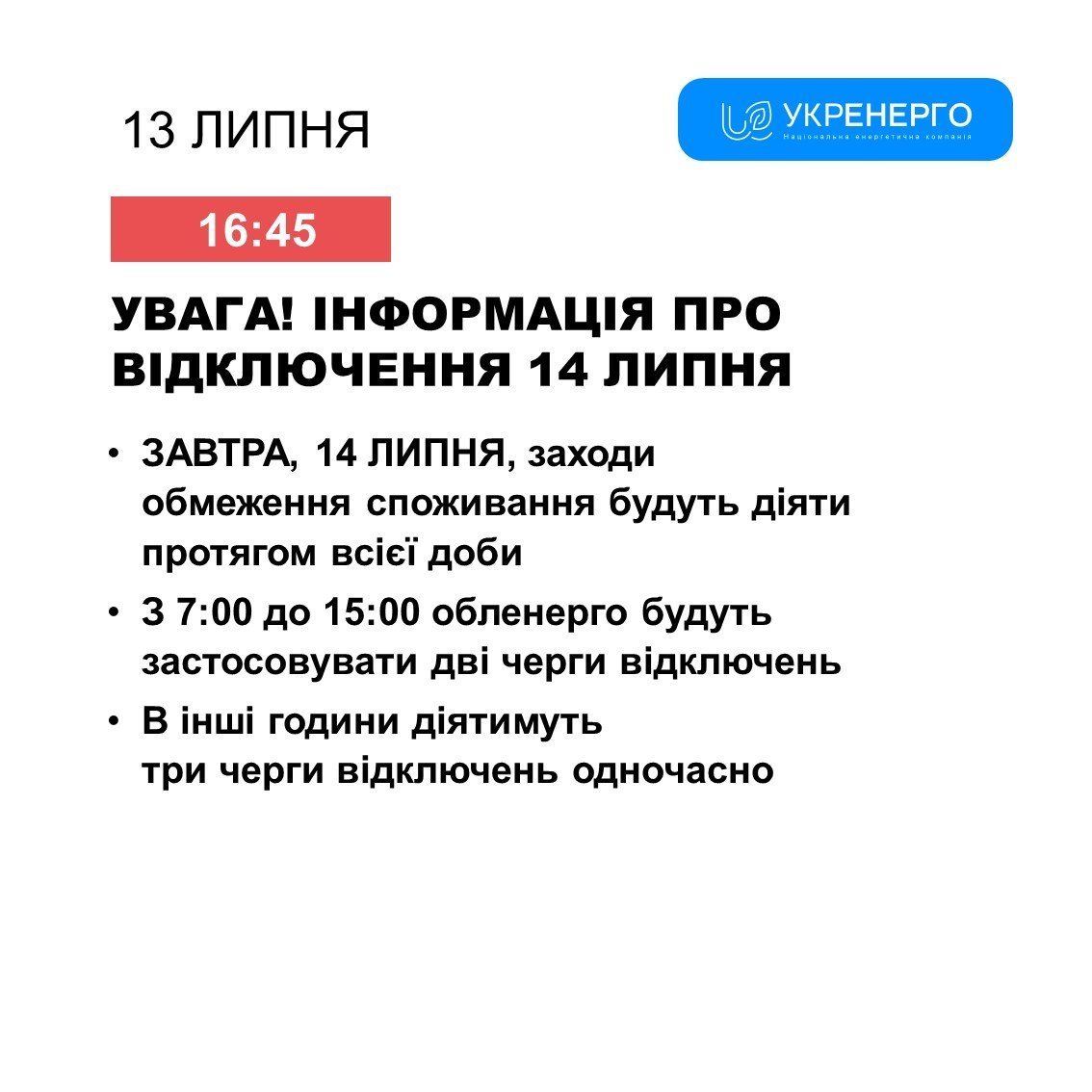 НЕК «Укренерго» повідомила, що завтра, 14 липня, графіки відключень електроенергії діятимуть для всіх регіонів України протягом усієї доби – з 00.00 до 24.00.