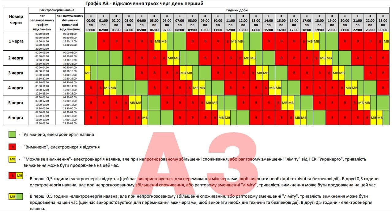 – До уваги споживачів електричної енергії! Отримана команда від НЕК «Укренерго» до 17.00 застосовувати одну чергу ГПВ – графік А1, а з 17.00 до 18.00 дві черги – графік А2, з 18.00 до 24.00 три черги – графік А3, – йдеться у повідомленні.